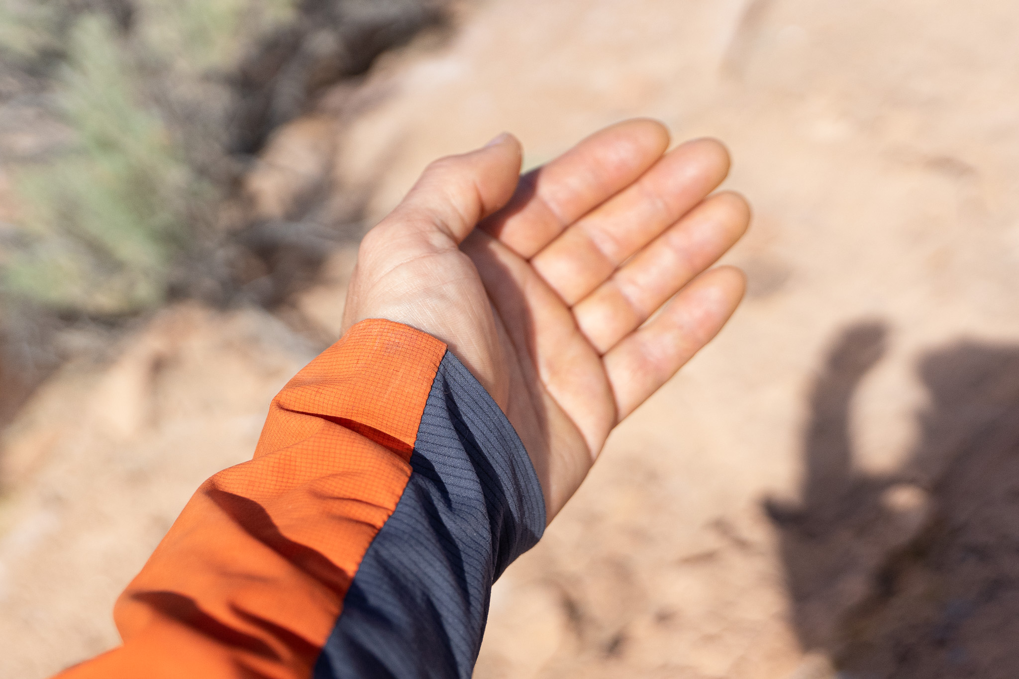 The Nano-Air Ultralight uses the same shell fabric with the same amazing next-to-skin feel as the rest of the line. Down at the forearms, it switches to lightweight Capilene paneling for even more breathability. I don’t notice a difference in comfort here, but like all Capilene, when it gets sweaty, it starts to smell.