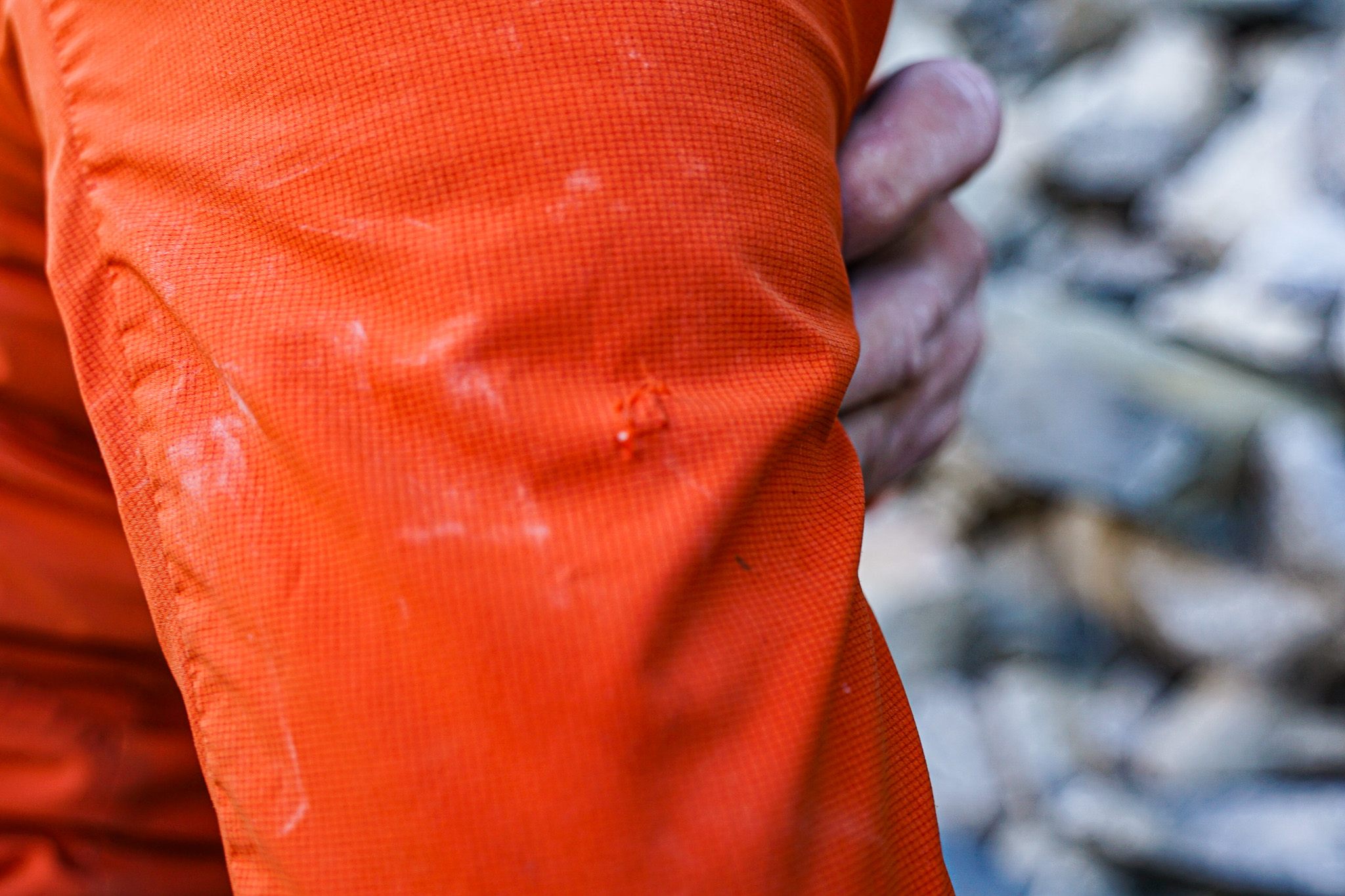 I ripped a small hole in the sleeve on my Nano-Air Ultralight the fourth time I wore it. I was climbing in the shade, feeling very comfy in my jacket, chimneying up a dihedral, and one little pointy piece of exfoliating granite catching on the fabric was all it took.